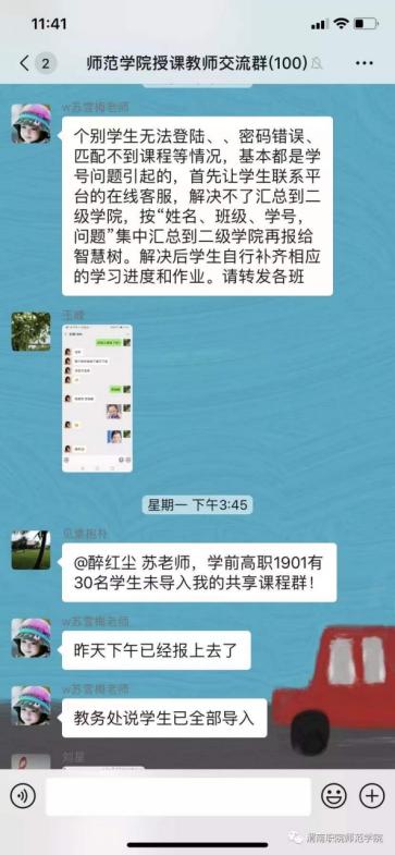 学生科积极安排辅导员、班主任督促学生进行线上学习。辅导员苏雪梅老师,除了所带班级的事务管理和教育教学任务,她还负责着学生数据核查汇总与智慧职教线上教学平台的对接。每当任课教师和学生反映平台所存在的问题时,她总是第一时间给予反馈,以保证师生的教育教学工作顺利进行。