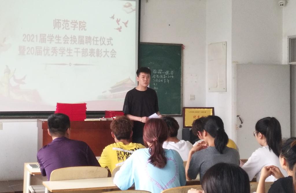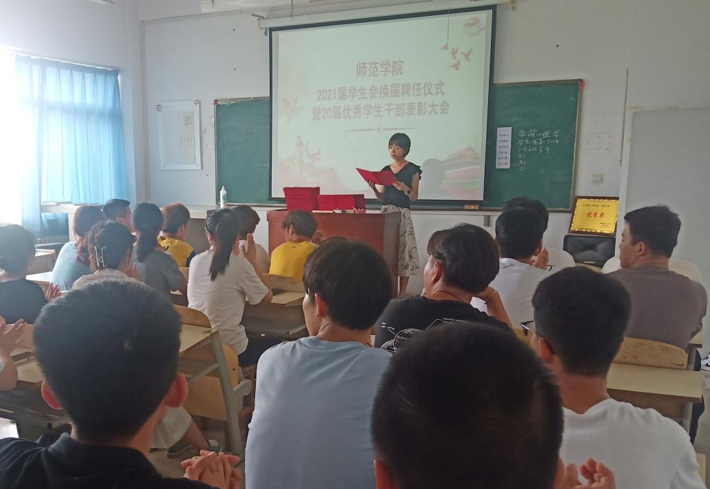 为促进beat365中文官网德育工作发展,激发新的活力,弘扬积极进取、乐于奉献的学生组织精神,7月6日,beat365中文官网2021届学生会换届聘任仪式暨20届优秀学生干部表彰大会在师范楼305室召开。全体辅导员及100余名学生代表参加大会。