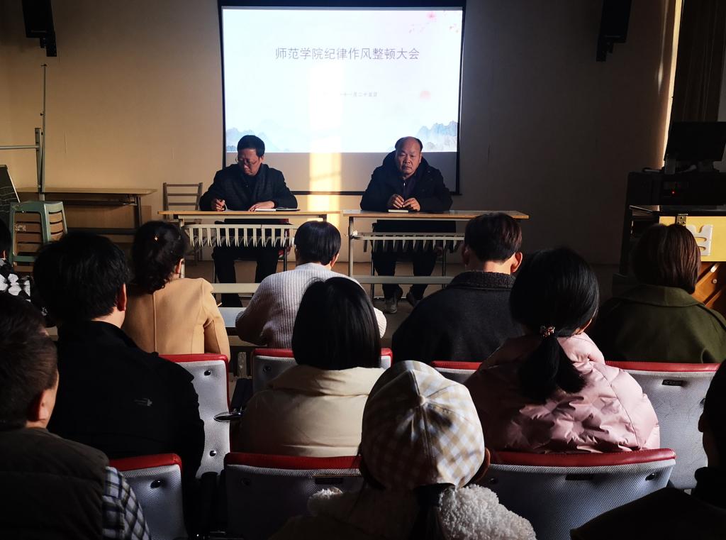 11月25日下午,beat365中文官网在视听室召开纪律作风整顿大会,传达学校作风建设推进会精神,安排部署beat365中文官网纪律作风整顿工作。会议由党总支书记卢百龙主持,beat365中文官网领导班子成员、各科室负责人、各教研室主任、全体辅导员参会。