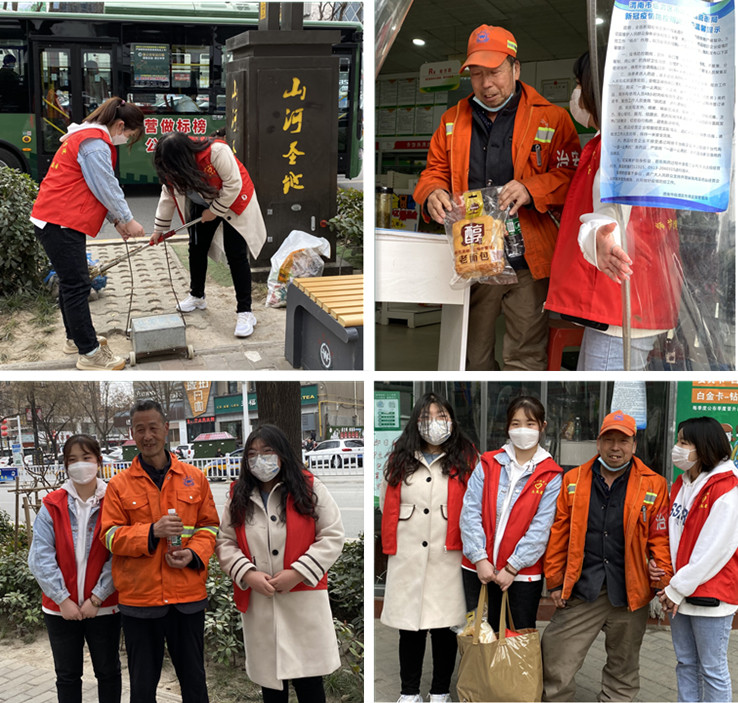 此次活动以团支部为单位,分组开展环境整治志愿服务活动。志愿者们拿着扫帚、簸箕等各种劳动工具,对校园公共场所以及校外周边街道等公共场所进行清洁打扫。春风送暖,爱心送情。志愿者们热情高涨、不怕脏、不怕累,清理路边花坛和街道上散落的废弃物、纸巾、果皮、食品袋等垃圾,大家仔细的打扫周围的角角落落,不放过任何一个小垃圾。为环卫工人们送上提前准备的水、毛巾、食物等日用品,向他们几十年如一日的辛勤付出,表达感谢与敬佩之情。