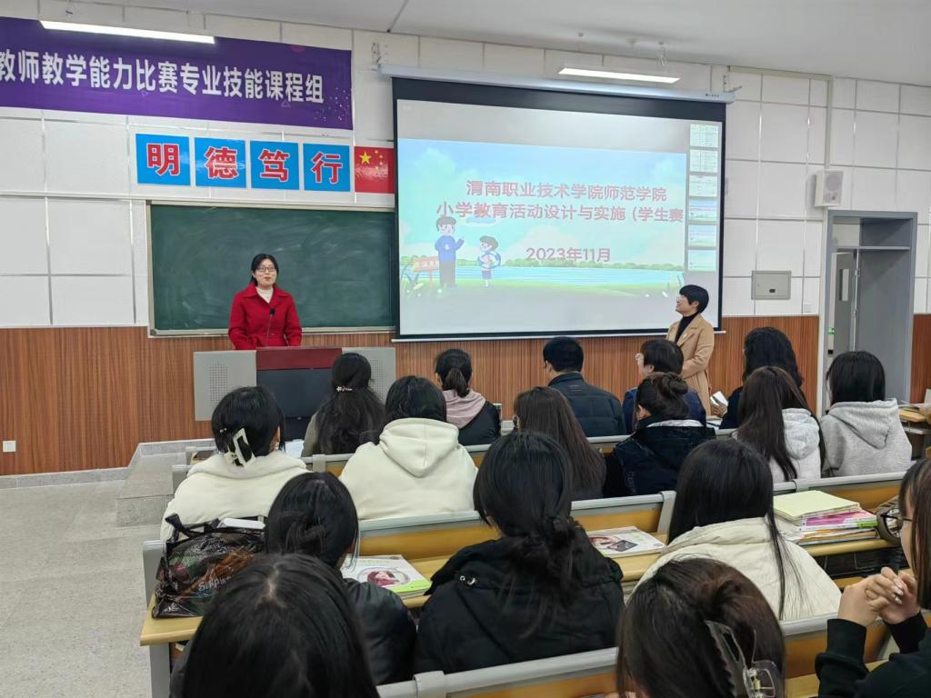 11月22日下午,beat365中文官网 “小学教育活动设计与实施(学生组)”技能大赛决赛在综合楼205教室开赛。比赛特邀渭南高新区第一小学校长杨富强为评委组组长,基础课部副主任郭宝莉、语文教研室主任王育华、beat365中文官网副院长于晶汝、校级教学名师杨楠楠任评委。校教务处副处长李新莉出席并宣布比赛开始。beat365中文官网小学教育专业教研室教师及百余名学生代表观摩了比赛。