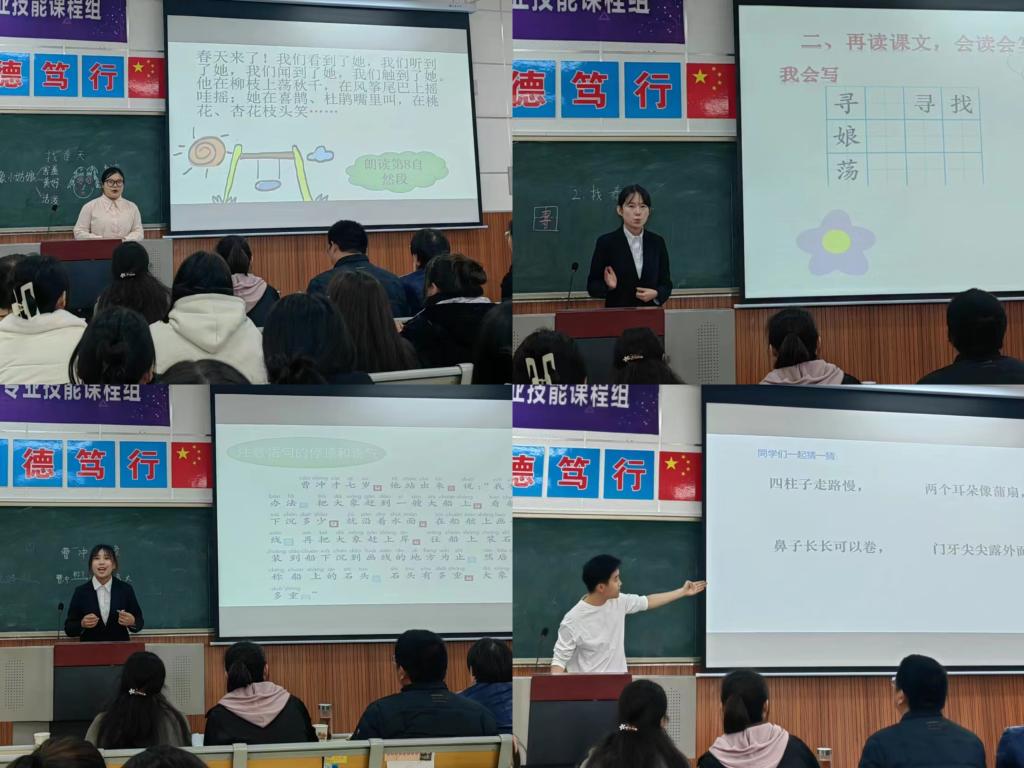 本次大赛聚焦小学新课标,对接省赛、国赛规则,由教学方案、原创教学课件、模拟课堂三部分组成。经过前期的初赛选拔,最终储妍、赵欣格等10名选手进入决赛,进行模拟课堂展示。