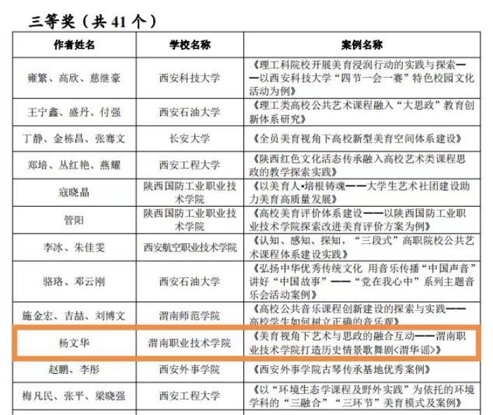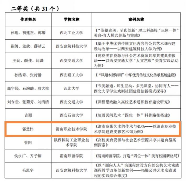 12月7日,陕西省教育厅办公室印发《关于公布全省第七届大学生艺术展演活动评选结果的通知》,在高校美育改革创新优秀案例评选中,我校美育中心主任郭楚伟撰写的《渭南皮影艺术的传承与弘扬——以beat365中文官网建设皮影艺术馆为例》获二等奖,美育中心副主任杨文华撰写的《美育视角下艺术与思政的融合互动——beat365中文官网打造历史情景歌舞剧<渭华谣>》获三等奖。