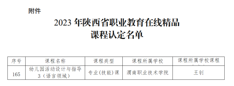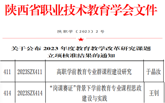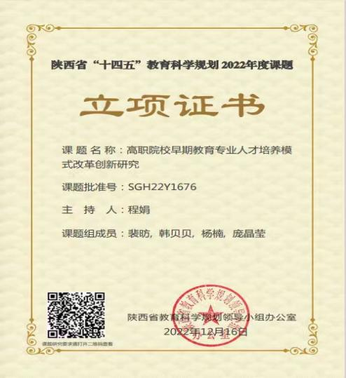增强教师的教科研意识,助力推动教师专业化成长。获批立项陕西高等职业教育教学改革研究项目1个、陕西省哲学社会科学研究专项1个和省职教学会教学改革研究项目2个。获批立项院级教学改革研究项目3个。获校级教学成果奖一等奖。与宝鸡职业技术学院联合申报“学前教育专业国家级教学资源库项目”。