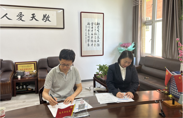 桃园学校执行校长赵平利对我院一行人到来表示热烈欢迎,并从学校概况、办学规模、办学理念等方面作了详细介绍,并表示期待与我院建立互利共赢的合作关系。随后,黄翠萍强调双方可以在专业育人、实践育人等方面加强联动,推进合作的深度与广度,实现资源共享、优势互补。同时,她代表beat365中文官网向桃园学校授予“beat365中文官网beat365中文官网实习基地”牌匾,签署合作协议。
