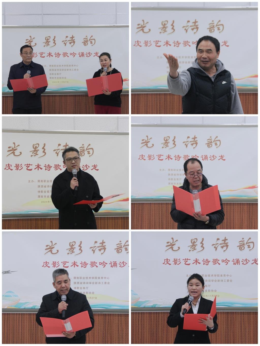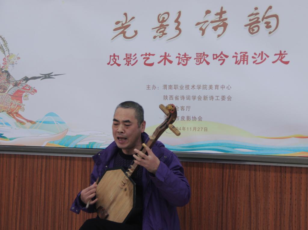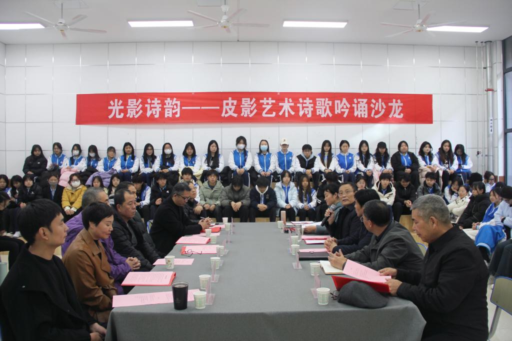 2024年11月27日下午,由我院美育中心、陕西省诗词学会新诗工委会、诗歌会客厅和渭南市皮影协会共同主办的“光影诗韵——皮影艺术诗歌吟诵沙龙”在综合楼合唱教室举行。中国冶金文协副会长、陕西省诗词学会副会长李永刚,中国煤矿文联朗诵分会副主席张弢,学院党委副书记王录军及渭南市皮影协会主席李天社等出席。美育中心副主任杨文华主持。