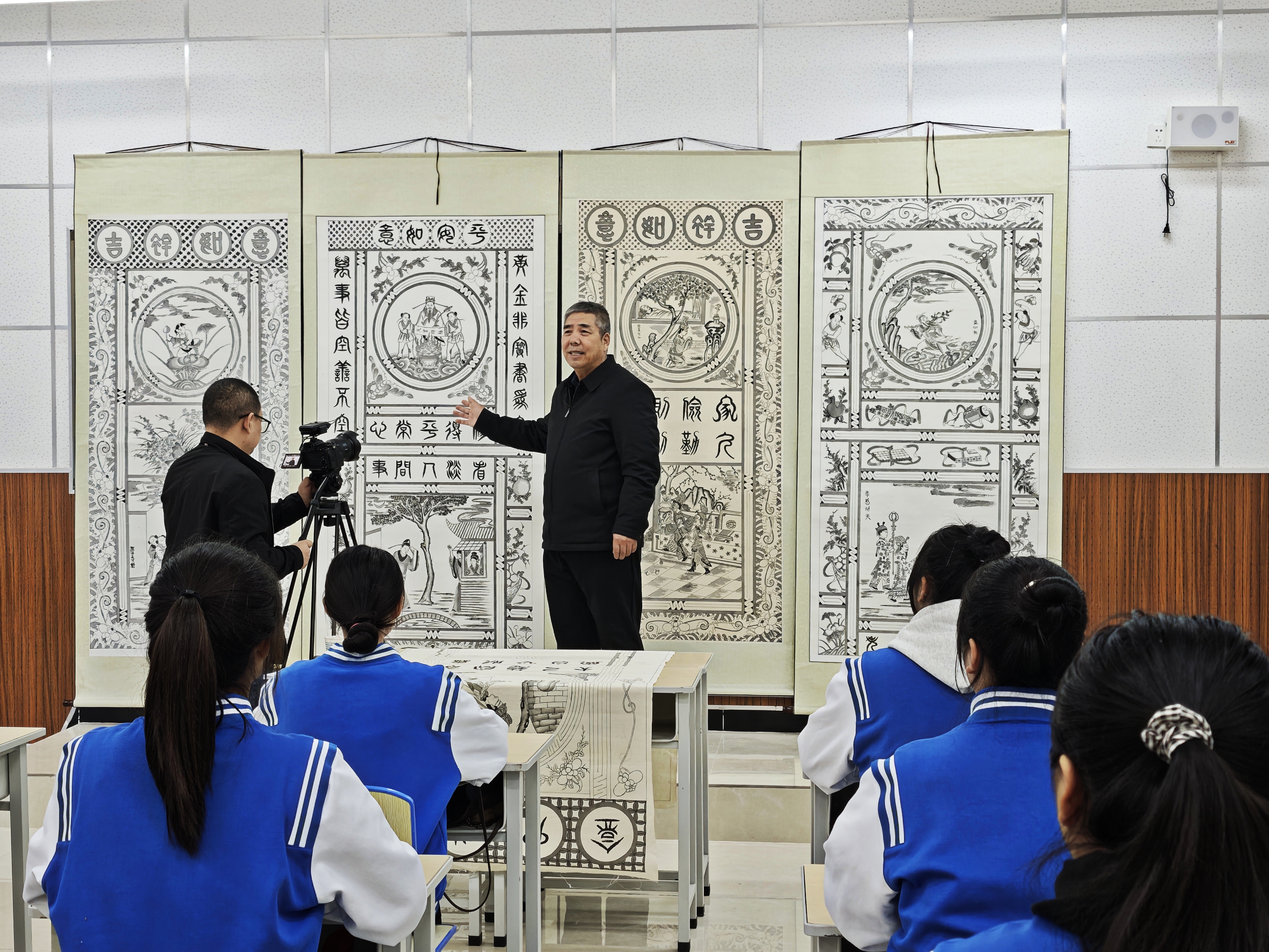 2024年12月3日,渭南广播电视台大型文化精品工程《百集非遗》栏目走进我院,由我院客座教授、渭南市皮影协会主席、省非物质文化遗产“澄城手绘门帘”传承人李天社为同学们讲授“澄城手绘门帘”的文化内涵与传承价值。活动由学院美育中心与渭南市民间文艺家协会共同承办。