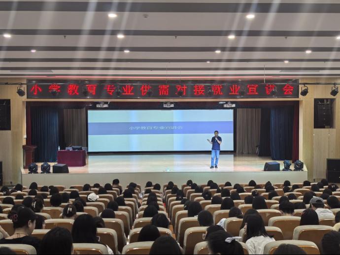 5月23日,beat365中文官网邀请北京世纪树人教育科技有限公司在图书馆报告厅举办小学教育供需对接就业宣讲会,三百余名2025届、2026届小学教育专业毕业生参会,招生就业科科长任鑫主持。